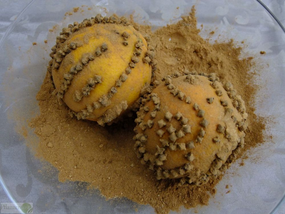 Orange, Mandarinen oder Zitronen waschen und trocken reiben. Mit einem Filzstift ein Muster vorzeichnen, entlang der Linien mit einem Zahnstocher oder einer Stricknadel dicht an dicht Löcher vorbohren. Dort hinein Gewürznelken stecken. In einer Schüssel Zimt, Kardamom, Muskat, Ingwer, Nelken jeweils in Pulverform mischen und die Früchte darin wälzen. An einen warmen Ort stellen, täglich mit dieser Gewürzmischung überstreuen und die Zitrusfrüchte immer wieder drehen – bis sie trocken sind.