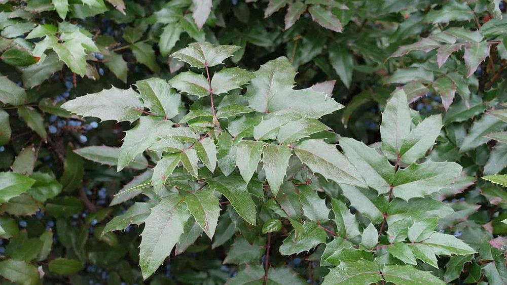 Etwa erbsengroß, graublau schimmernd, wie kleine Weintrauben stechen einem die Früchte der Gewöhnlichen Mahonie (Mahonia aquifolium) ins Auge. Sie wächst in sonnigen bis halbschattigen Bereichen in vielen Gärten und Parks, steht aber auch in Grünstreifen, im Straßenbegleitgrün, in Gebüschen, manchmal am Waldrand. Ursprünglich stammt dieser immergrüne Strauch aus dem westlichen Nordamerika, in Europa stellt man sie zu den Neophyten. Im US-Bundesstaat ist die Mahonie die offizielle Staatspflanze, wird dort Oregon Grape genannt, also „Oregon-Traube“.