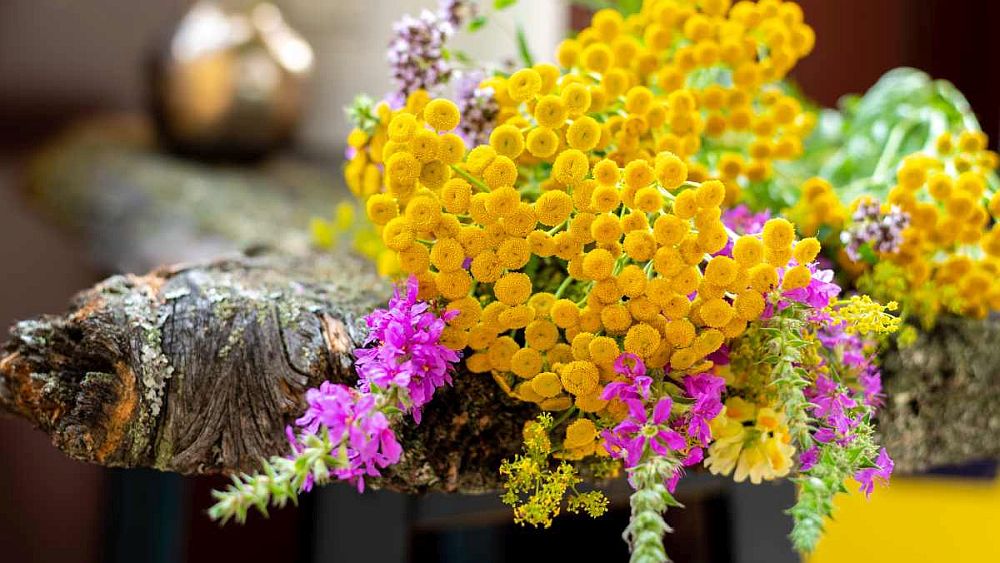 Im Übergang vom Sommer zum Herbst leuchtet der Rainfarn (Tanacetum vulgare) mit goldgelben Blüten, vor allem entlang von Feld- und Wegrändern, Bächen und Gräben, an Schuttplätzen und Bahndämmen, gerne auch dort, wo es gebrannt hat (Johannifeuerstellen u.ä.). Beifuß (Artemisia vulgaris), Wilde Möhre (Daucus carota), Große Klette (Arctium lappa), Weißer Gänsefuß (Chenopodium album) und Königskerzen (Verbascum) sind häufig seine Begleiter.