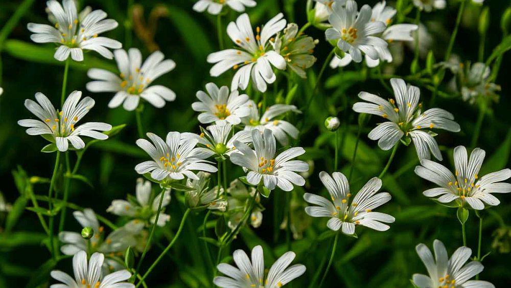 Krokusse, Tulpen, Primeln – diese Blumen des Frühlings kennt jeder. Aber wie steht es um heimische Frühlingsblumen wie die Große oder Echte Sternmiere (Rabelera holostea, syn. Stellaria holostea)? Die zeigt sich ab April von ihrer schönsten Seite mit unzähligen weißen Blütensternen, zierlich und strahlend weiß, entlang von Hecken und Gebüschen wie in lockeren Waldpartien. Ich bewundere die filigran gebauten Blüten dieses Nelkengewächses sehr. Weil die fünf Kronblätter tief geschlitzt sind, wirkt jede Blüte wie ein zehnstrahliger Stern. Sie entfalten sich über grasartigen Blättern an weich behaarten Stängeln, die sich gegenseitig stützen müssen oder zwischen anderen Pflanzen Halt suchen. Danach nennt man die Große Sternmiere auch Grasblume oder Jungferngras.