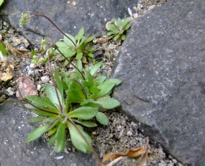 In Pflasterfugen, in Ritzen zwischen Asphalt, auf Kiesflächen, an steinigen Wegrändern, entlang sandiger Ackerraine, auch an mageren Standorten im Garten trifft man es: das Hungerblümchen (Erophila verna).